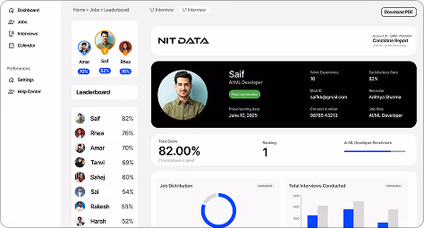 Compare candidates with an AI-powered leaderboard and download detailed reports with scores, insights, and hiring recommendations.